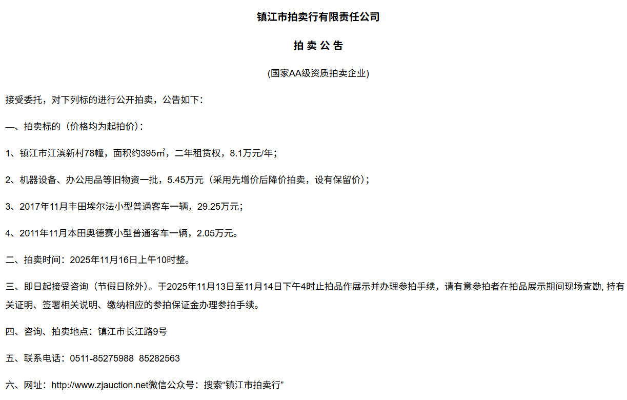 鎮江市拍賣行有限責任公司拍 租 公 吿(國家AA級資質拍賣企業)接受委托,對下列標的進行公開拍租(三拍),公告如下:—、拍租標的(以下價格均為半年至3年租賃權起拍價):1.  建行揚中豐裕支行營業網點二、三、四層經營用房(揚中市三茅鎮三豐南路5號),租賃面積約1080㎡,每層面積約360㎡,三拍底價11.98萬/年(0.3元/平方米/天)。2.  建行揚中油坊支行營業網點三、四層經營用房(揚中市油坊鎮太陽路129號),租賃面積約590㎡,每層面積約295㎡,三拍底價5.34萬/年(0.25元/平方米/天)。3. 建行揚中八橋支行營業網點三、四層經營用房(揚中市八橋鎮太平北路29號),租賃  面積約400㎡,三層約185㎡,四層約215㎡,三拍底價4.43萬/年(0.25元/平方米/天)。以上3套房產均可分層部分出租,拍租價=拍租面積*每平方米每天的租賃單價4. 建行鎮江團山路支行營業網點一層經營用房(鎮江市檀山路8號60幢102、103室),租賃面積約597.09㎡,三拍底價34.52萬/年。5. 建行丹陽原賢橋分理處營業用房(丹陽市城河路15-21號),租賃面積約93.88㎡,二拍底價7.16萬/年。二、拍租時間:2025年11月23日上午10時整。三、即日起接受咨詢(節假日除外)。于11月17日至11月21日下午4時止拍品作展示并辦理參拍手續,請有意參拍者在拍品展示期間現場查勘,持有關證明、簽署相關說明、繳納相應的參拍保證金辦理參拍手續。四、咨詢、拍租地點:鎮江市長江路9號五、聯系方式:0511-85275988   13655299933楊先生六、網址:http://www_zjauction_net.11d52j.cn;微信公眾號:搜索“鎮江市拍賣行” 拍品清單2025.11.23序號名稱起拍價(元)標的說明1建行揚中豐裕支行營業網點二、三、四層經營用房(揚中市三茅鎮三豐南路5號),租賃面積約1080㎡,每層面積約360㎡三拍底價11.98萬/年(0.3元/平方米/天)1、1-3號房產均可分層部分出租,拍租價=拍租面積*每平方米每天的租賃單價;2、意向競拍人在拍賣前需持營業執照或身份證與委托方說明租賃房產經營業態,確定意向后出具房產承租用途承諾書,經委托方審核后,方可交納保證金參加競拍;3、租賃期限為半年至3年(承租方與出租方協商而定),承租方每半年或一年結付租金,租賃期間的水、電費用及其它相關費用均由承租方承擔;4、承租方不得用于經營和保管危險物品,不得用于開設餐飲、娛樂等可能嚴重影響消防安全、運營安全的經營業態,不得用于經營委托貸款、小額貸款等可能冒用委托方名義,帶來聲譽風險的經營業態。租賃期內,承租方不得破壞墻體結構,自行成就消防、安全等使用條件,不得擅自將租賃房屋轉租、轉讓給他人使用,否則委托方有權收回房屋;5、拍租成交后,承租方將租金交至出租方指定賬戶,傭金交至拍賣方賬戶(拍租傭金為該房屋一個月租金)。承租方憑租賃合同無息退還保證金。2建行揚中油坊支行營業網點三、四層經營用房(揚中市油坊鎮太陽路129號),租賃面積約590㎡,每層面積約295㎡三拍底價5.34萬/年(0.25元/平方米/天)3建行揚中八橋支行營業網點三、四層經營用房(揚中市八橋鎮太平北路29號),租賃面積約490㎡,每層面積約245㎡三拍底價4.43萬/年(0.25元/平方米/天)4建行鎮江團山路支行營業網點一層經營用房(鎮江市檀山路8號60幢102、103室),建筑面積約597.09㎡三拍底價34.52萬/年5建行丹陽原賢橋分理處營業用房(丹陽市城河路15-21號),建筑面積約93.88㎡二拍底價7.16萬/年